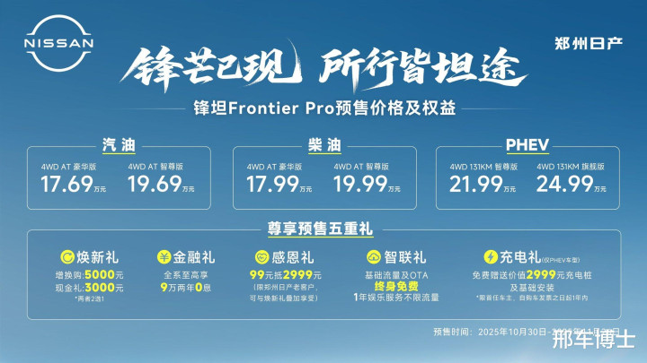10月30日牛博,“锋芒已现 所行皆坦途——Frontier Pro预售暨品鉴交流会”成功举办,郑州日产Frontier Pro正式开启预售,6款配置可选!锋坦Frontier Pro预售价格17.69万-19.99万元,锋坦Frontier Pro PHEV预售价格21.99万-24.99万元。